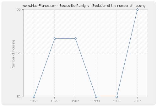 The number of housing of Bossus-lès-Rumigny was 55 in 2007, 52 in 1999, 52 in 1990, 54 in 1982, 54 in 1975 and 52 in 1968.