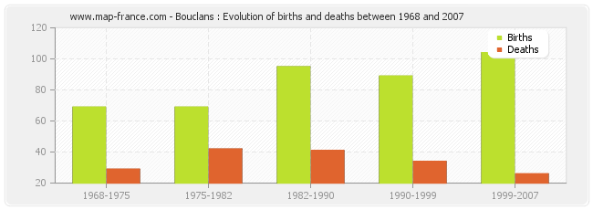 Bouclans : evolution of births and deaths from 1968 to 2007