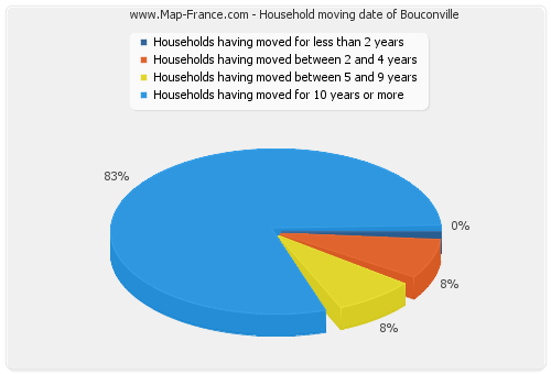 - Number of households of Bouconville having moved between 2 and 5 years : 2 - Number of households of Bouconville having moved between 5 and 9 years : 2 - Number of households of Bouconville having moved for 10 years or more : 20 |