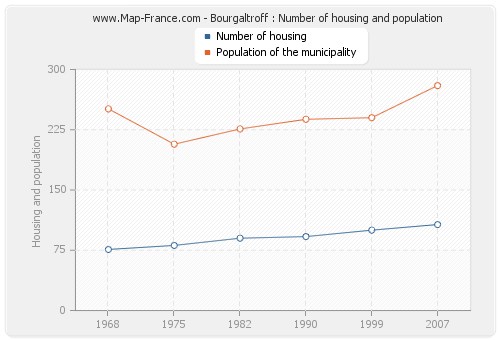 The population of Bourgaltroff was 280 inhabitants in 2007, 240 inhabitants in 1999, 238 inhabitants in 1990, 226 inhabitants in 1982, 207 inhabitants in 1975 and 251 inhabitants in 1968. Meanwhile, the number of housing of Bourgaltroff was 107 in 2007, 100 in 1999, 92 in 1990, 90 in 1982, 81 in 1975 and 76 in 1968.