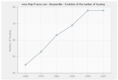 The number of housing of Bousseviller was 78 in 2007, 78 in 1999, 69 in 1990, 63 in 1982, 53 in 1975 and 45 in 1968.