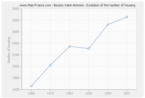 The number of housing of Boussy-Saint-Antoine was 2 859 in 2007, 2 726 in 1999, 2 310 in 1990, 2 348 in 1982, 2 026 in 1975 and 1 662 in 1968.