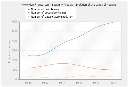 The following graphs show the history of the number and the type of housing of Boutigny-Prouais from 1968 to 2007. The second graph is drawn in cubic interpolation. This allows to obtain more exactly the number of accommodation of the town of Boutigny-Prouais years where no inventory was made.
