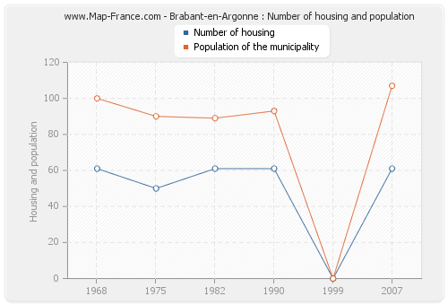 The population of Brabant-en-Argonne was 107 inhabitants in 2007, 0 inhabitants in 1999, 93 inhabitants in 1990, 89 inhabitants in 1982, 90 inhabitants in 1975 and 100 inhabitants in 1968. Meanwhile, the number of housing of Brabant-en-Argonne was 61 in 2007, 0 in 1999, 61 in 1990, 61 in 1982, 50 in 1975 and 61 in 1968.
