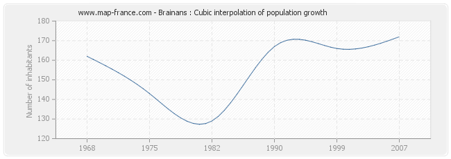 This curve shows the history of the population of Brainans from 1968 to 2007 in cubic interpolation. This provides more precisely the population of the municipality of Brainans the years where no census has been taken.
