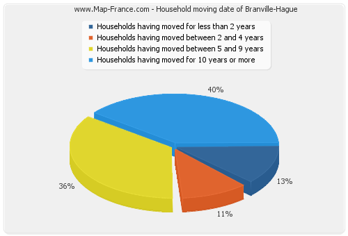 - Number of households of Branville-Hague having moved between 2 and 5 years : 6 - Number of households of Branville-Hague having moved between 5 and 9 years : 20 - Number of households of Branville-Hague having moved for 10 years or more : 22 |