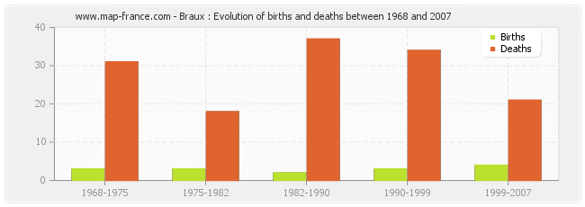 Population of Braux was 130 inhabitants in 2007, 118 inhabitants in 1999, 133 inhabitants in 1990, 160 inhabitants in 1982, 153 inhabitants in 1975 and 206 inhabitants in 1968.