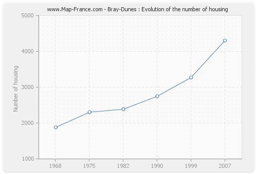 The number of housing of Bray-Dunes was 4 304 in 2007, 3 274 in 1999, 2 748 in 1990, 2 387 in 1982, 2 304 in 1975 and 1 881 in 1968.