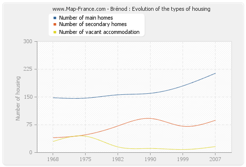 The number of housing of Brénod was 317 in 2007, 259 in 1999, 263 in 1990, 243 in 1982, 239 in 1975 and 218 in 1968.
