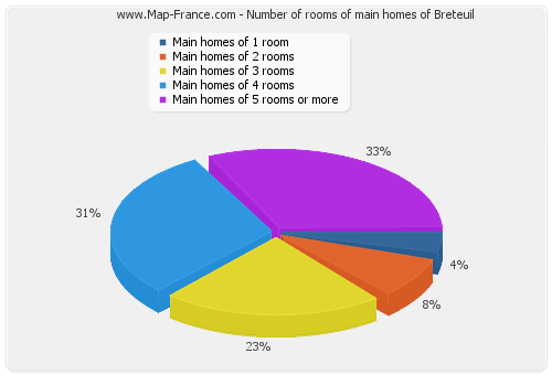 - Number of main homes of Breteuil of 1 room : 61 - Number of main homes of Breteuil of 2 rooms : 121 - Number of main homes of Breteuil of 3 rooms : 334 - Number of main homes of Breteuil of 4 rooms : 334 - Number of main homes of Breteuil of 5 rooms and more : 475 |