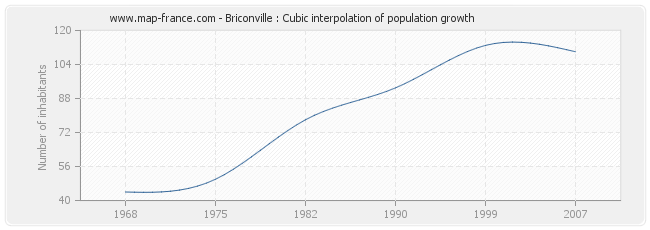 This curve shows the history of the population of Briconville from 1968 to 2007 in cubic interpolation. This provides more precisely the population of the municipality of Briconville the years where no census has been taken.