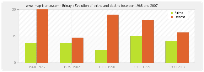 Population of Brinay was 154 inhabitants in 2007, 137 inhabitants in 1999, 138 inhabitants in 1990, 163 inhabitants in 1982, 169 inhabitants in 1975 and 186 inhabitants in 1968.