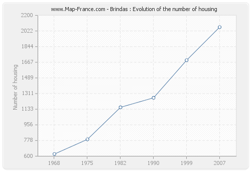 The number of housing of Brindas was 2 066 in 2007, 1 690 in 1999, 1 263 in 1990, 1 155 in 1982, 791 in 1975 and 624 in 1968.
