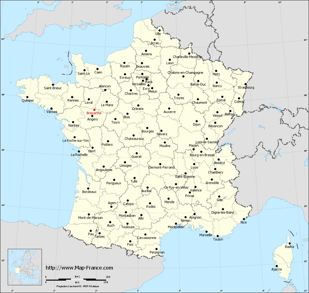 Map of Brissarthe with regions and prefectures