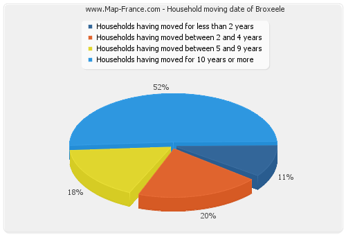 - Number of households of Broxeele having moved between 2 and 5 years : 23 - Number of households of Broxeele having moved between 5 and 9 years : 20 - Number of households of Broxeele having moved for 10 years or more : 59 |