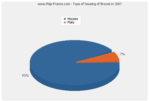 In 2007 the accommodations of Broyes consisted of 49 main homes, 8 second homes and 3 vacant accommodations.