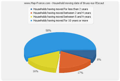 - Number of households of Bruay-sur-l'Escaut having moved between 2 and 5 years : 761 - Number of households of Bruay-sur-l'Escaut having moved between 5 and 9 years : 716 - Number of households of Bruay-sur-l'Escaut having moved for 10 years or more : 2 545 |