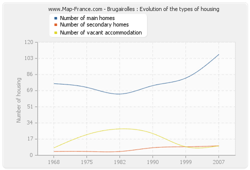The following graphs show the history of the number and the type of housing of Brugairolles from 1968 to 2007. The second graph is drawn in cubic interpolation. This allows to obtain more exactly the number of accommodation of the town of Brugairolles years where no inventory was made.