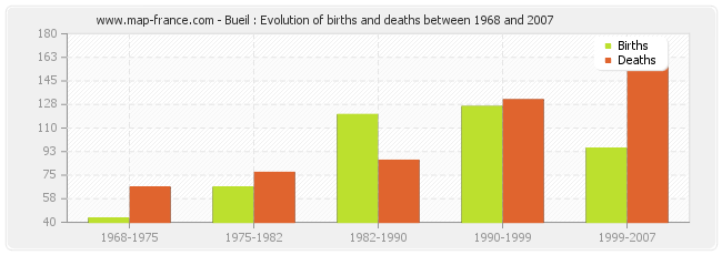 Population of Bueil was 1 501 inhabitants in 2007, 1 403 inhabitants in 1999, 1 331 inhabitants in 1990, 1 003 inhabitants in 1982, 526 inhabitants in 1975 and 455 inhabitants in 1968.