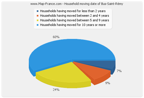 - Number of households of Bus-Saint-Rémy having moved between 2 and 5 years : 10 - Number of households of Bus-Saint-Rémy having moved between 5 and 9 years : 26 - Number of households of Bus-Saint-Rémy having moved for 10 years or more : 64 |