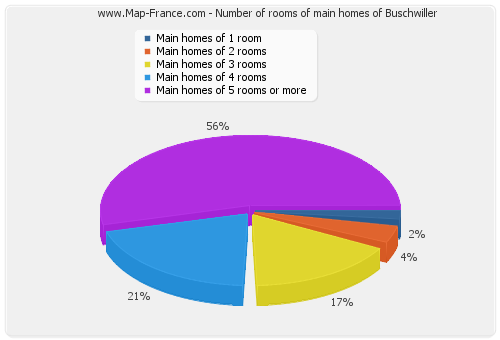 - Number of main homes of Buschwiller of 1 room : 8 - Number of main homes of Buschwiller of 2 rooms : 16 - Number of main homes of Buschwiller of 3 rooms : 69 - Number of main homes of Buschwiller of 4 rooms : 69 - Number of main homes of Buschwiller of 5 rooms and more : 225 |