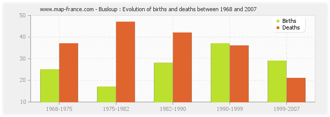 This curve shows the history of the population of Busloup from 1968 to 2007 in cubic interpolation. This provides more precisely the population of the municipality of Busloup the years where no census has been taken.
