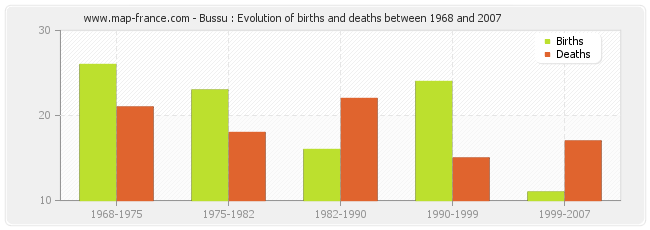 Population of Bussu was 216 inhabitants in 2007, 229 inhabitants in 1999, 231 inhabitants in 1990, 260 inhabitants in 1982, 244 inhabitants in 1975 and 255 inhabitants in 1968.