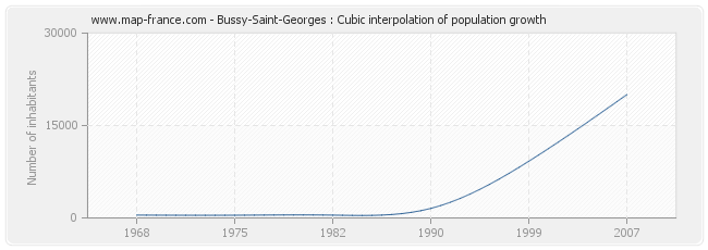 This curve shows the history of the population of Bussy-Saint-Georges from 1968 to 2007 in cubic interpolation. This provides more precisely the population of the municipality of Bussy-Saint-Georges the years where no census has been taken.