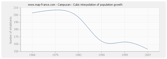 This curve shows the history of the population of Campuzan from 1968 to 2007 in cubic interpolation. This provides more precisely the population of the municipality of Campuzan the years where no census has been taken.