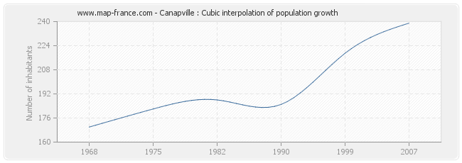 This curve shows the history of the population of Canapville from 1968 to 2007 in cubic interpolation. This provides more precisely the population of the municipality of Canapville the years where no census has been taken.