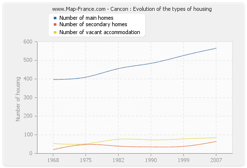 The number of housing of Cancon was 713 in 2007, 642 in 1999, 592 in 1990, 571 in 1982, 510 in 1975 and 471 in 1968.