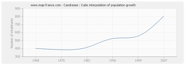 This curve shows the history of the population of Candresse from 1968 to 2007 in cubic interpolation. This provides more precisely the population of the municipality of Candresse the years where no census has been taken.