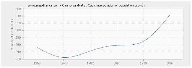 This curve shows the history of the population of Canny-sur-Matz from 1968 to 2007 in cubic interpolation. This provides more precisely the population of the municipality of Canny-sur-Matz the years where no census has been taken.
