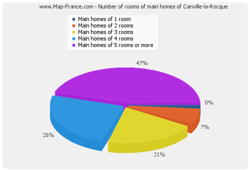 - Number of main homes of Canville-la-Rocque of 1 room : 0 - Number of main homes of Canville-la-Rocque of 2 rooms : 4 - Number of main homes of Canville-la-Rocque of 3 rooms : 12 - Number of main homes of Canville-la-Rocque of 4 rooms : 12 - Number of main homes of Canville-la-Rocque of 5 rooms and more : 27 |