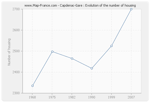 The number of housing of Capdenac-Gare was 2 700 in 2007, 2 525 in 1999, 2 418 in 1990, 2 465 in 1982, 2 498 in 1975 and 2 335 in 1968.