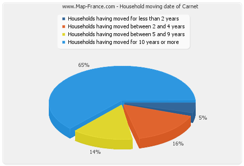 - Number of households of Carnet having moved between 2 and 5 years : 31 - Number of households of Carnet having moved between 5 and 9 years : 27 - Number of households of Carnet having moved for 10 years or more : 123 |