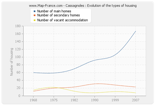 The number of housing of Cassagnoles was 199 in 2007, 145 in 1999, 131 in 1990, 105 in 1982, 101 in 1975 and 87 in 1968.