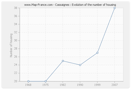 The number of housing of Cassaignes was 38 in 2007, 27 in 1999, 24 in 1990, 25 in 1982, 20 in 1975 and 20 in 1968.