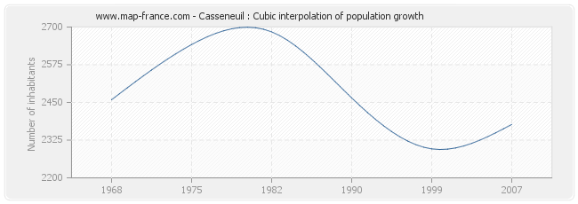 This curve shows the history of the population of Casseneuil from 1968 to 2007 in cubic interpolation. This provides more precisely the population of the municipality of Casseneuil the years where no census has been taken.