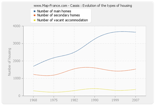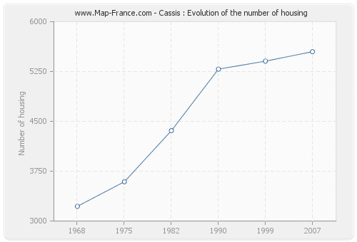 The number of housing of Cassis was 5 549 in 2007, 5 406 in 1999, 5 286 in 1990, 4 360 in 1982, 3 591 in 1975 and 3 221 in 1968.