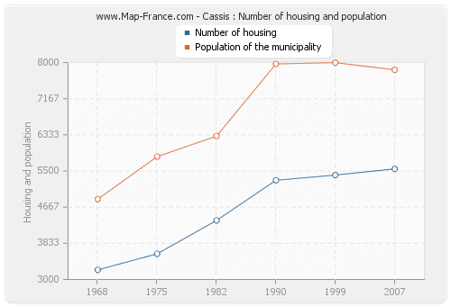The population of Cassis was 7 833 inhabitants in 2007, 7 998 inhabitants in 1999, 7 967 inhabitants in 1990, 6 304 inhabitants in 1982, 5 831 inhabitants in 1975 and 4 852 inhabitants in 1968. Meanwhile, the number of housing of Cassis was 5 549 in 2007, 5 406 in 1999, 5 286 in 1990, 4 360 in 1982, 3 591 in 1975 and 3 221 in 1968.