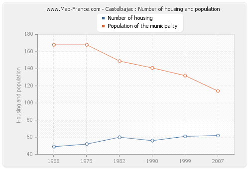 The population of Castelbajac was 114 inhabitants in 2007, 132 inhabitants in 1999, 141 inhabitants in 1990, 149 inhabitants in 1982, 168 inhabitants in 1975 and 168 inhabitants in 1968. Meanwhile, the number of housing of Castelbajac was 62 in 2007, 61 in 1999, 56 in 1990, 60 in 1982, 52 in 1975 and 49 in 1968.