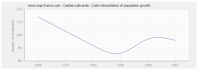 Population of Casties-Labrande was 96 inhabitants in 2007, 97 inhabitants in 1999, 86 inhabitants in 1990, 92 inhabitants in 1982, 103 inhabitants in 1975 and 114 inhabitants in 1968.