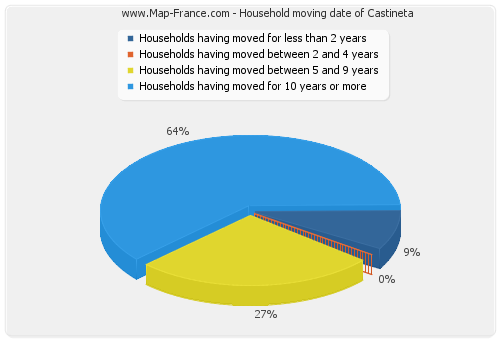 - Number of households of Castineta having moved between 2 and 5 years : 0 - Number of households of Castineta having moved between 5 and 9 years : 6 - Number of households of Castineta having moved for 10 years or more : 14 |