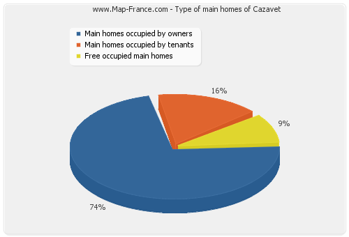- Number of main homes of Cazavet occupied by owners : 63 - Number of main homes of Cazavet occupied by tenants : 14 - Number of main homes of Cazavet occupied free of charge : 8 |