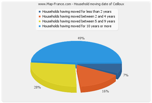 - Number of households of Ceilloux having moved between 2 and 5 years : 11 - Number of households of Ceilloux having moved between 5 and 9 years : 19 - Number of households of Ceilloux having moved for 10 years or more : 34 |