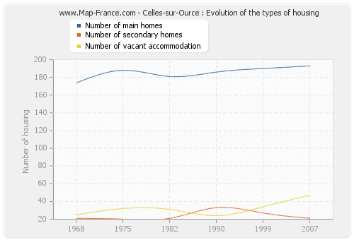 The following graphs show the history of the number and the type of housing of Celles-sur-Ource from 1968 to 2007. The second graph is drawn in cubic interpolation. This allows to obtain more exactly the number of accommodation of the town of Celles-sur-Ource years where no inventory was made.