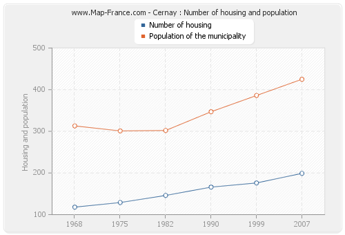 The population of Cernay was 425 inhabitants in 2007, 386 inhabitants in 1999, 347 inhabitants in 1990, 302 inhabitants in 1982, 301 inhabitants in 1975 and 313 inhabitants in 1968. Meanwhile, the number of housing of Cernay was 199 in 2007, 176 in 1999, 166 in 1990, 146 in 1982, 129 in 1975 and 118 in 1968.