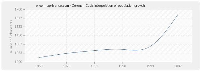 This curve shows the history of the population of Cérons from 1968 to 2007 in cubic interpolation. This provides more precisely the population of the municipality of Cérons the years where no census has been taken.