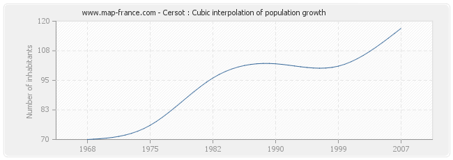 This curve shows the history of the population of Cersot from 1968 to 2007 in cubic interpolation. This provides more precisely the population of the municipality of Cersot the years where no census has been taken.